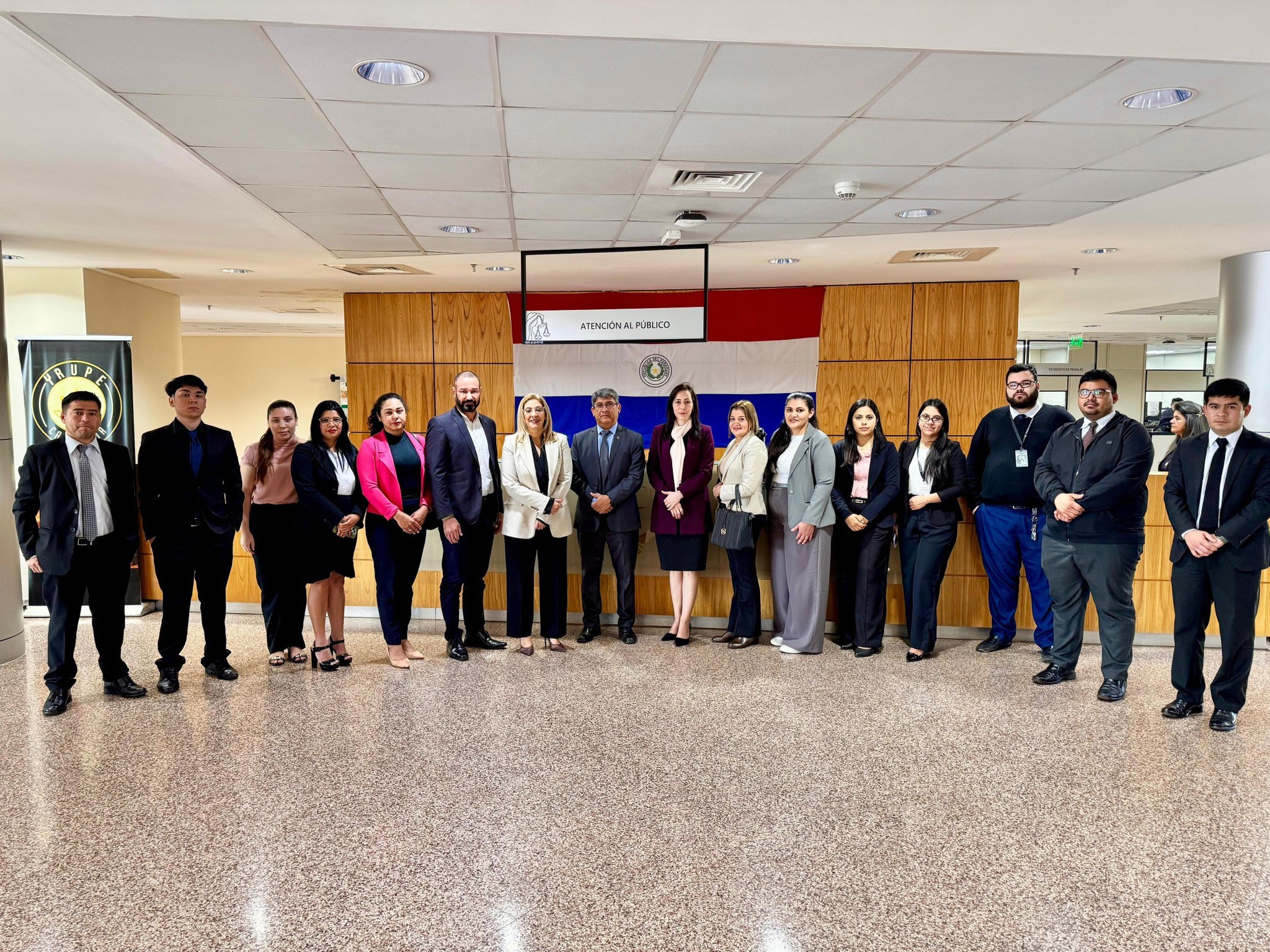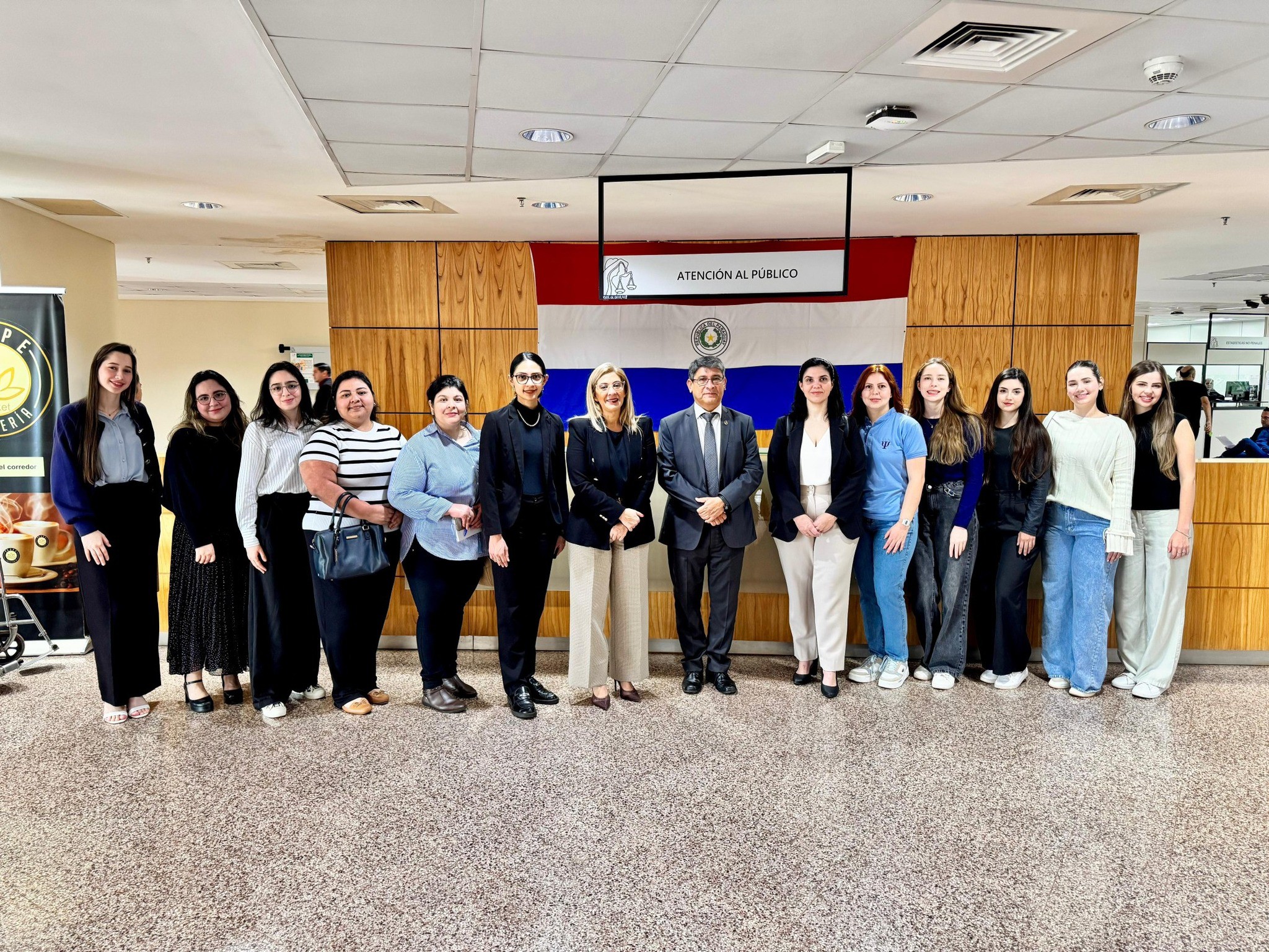 La presidente Dra. Juliana Giménez Portillo, el Dr. Efrén Giménez Vázquez y la Dra. Ybete Welter de Troes, recibieron en el hall central del Palacio de Justicia a la comitiva de la Universidad Nacional del Este, integrada por docentes y alumnos de la clase de Medicin...